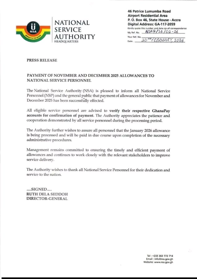 The National Service Authority (NSA) has officially announced the successful payment of allowances for November and December 2025 to all National Service Personnel (NSP) across the country.