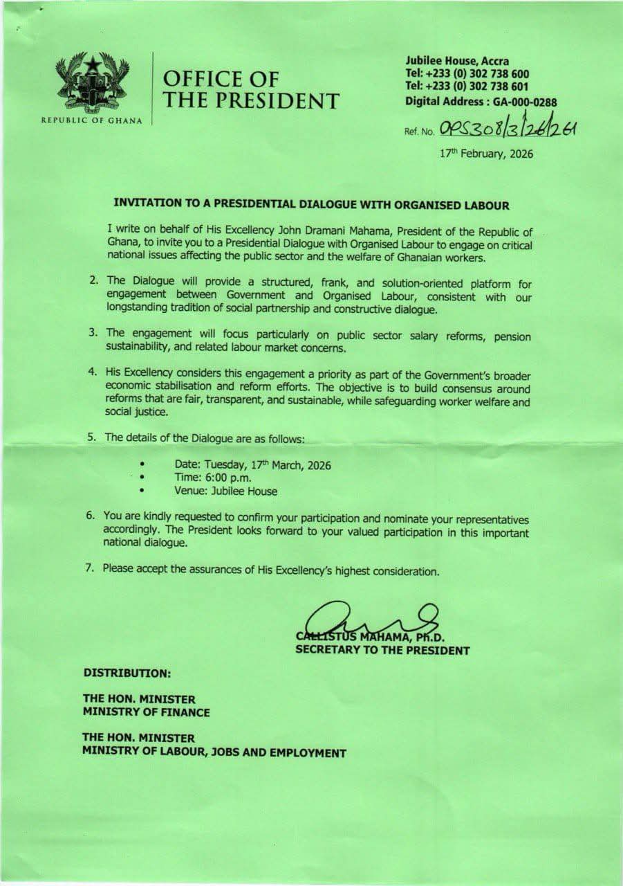The Government of Ghana has officially invited Organised Labour to a Presidential Dialogue scheduled for Tuesday, March 17, 2026, at Jubilee House. The invitation, issued on behalf of John Dramani Mahama, highlights the government’s commitment to strengthening collaboration between the government and workers in addressing key national issues.